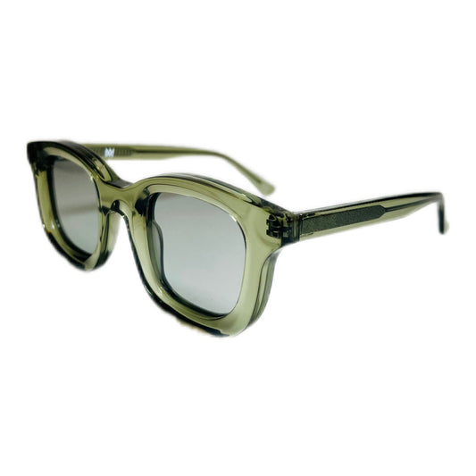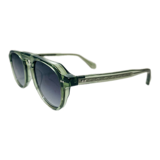The 4AM FUKUOKA 15:00 series features stylish aviator sunglasses that blend casual elegance with a unique military green transparent design.